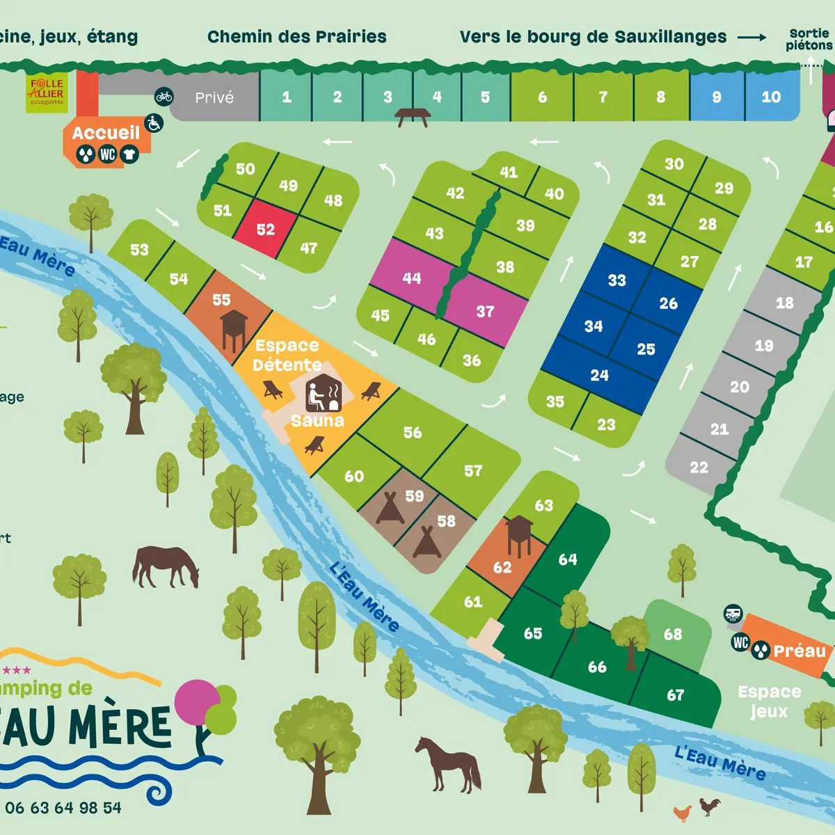 Le camping est situé dans un parc arboré, le long de la rivière Eau Mère, sur la zone de Loisirs des Prairies, tennis, étangs de pêche, aire de jeux et piscine municipale en accès libre ( juillet et août), idéalement situé à 10 mn à pied -5mn en vélo - des commerces, restaurants et marché de Sauxillanges.