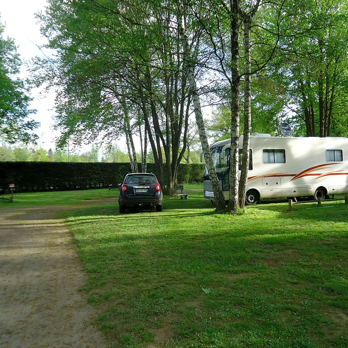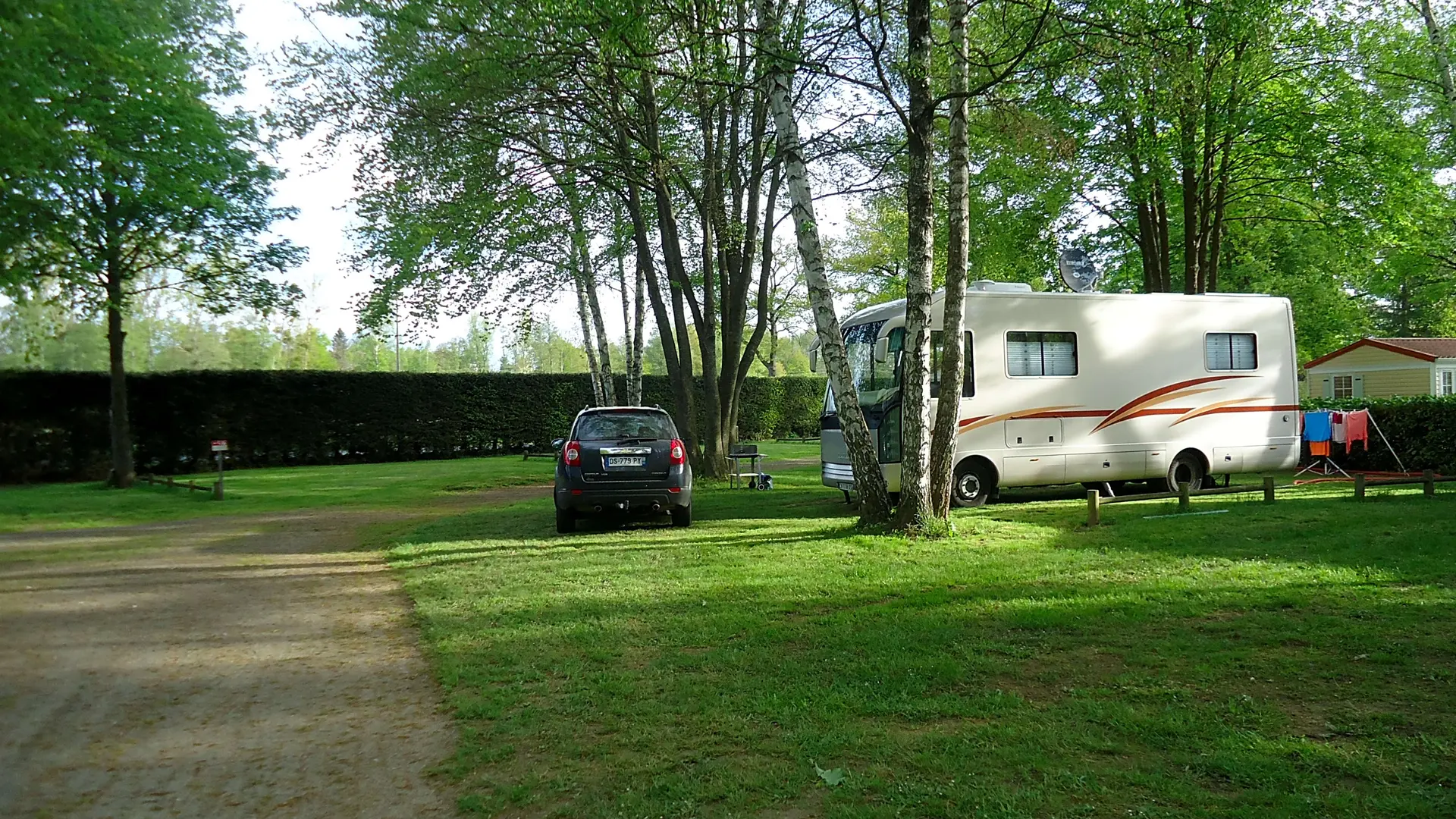 Dans le camping, emplacement dédié au camping-car, plat et herbé, 80m² minimum, 1/6p, électricité, accessible PMR, borne vidange, wifi, animaux acceptés. Aire situé dans un parc arboré, le long de la rivière Eau Mère. Service Pain/Bar/Restauration.