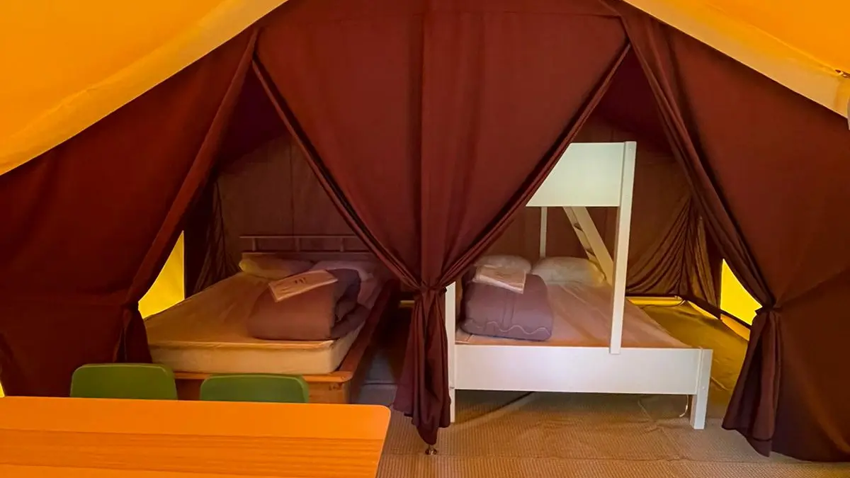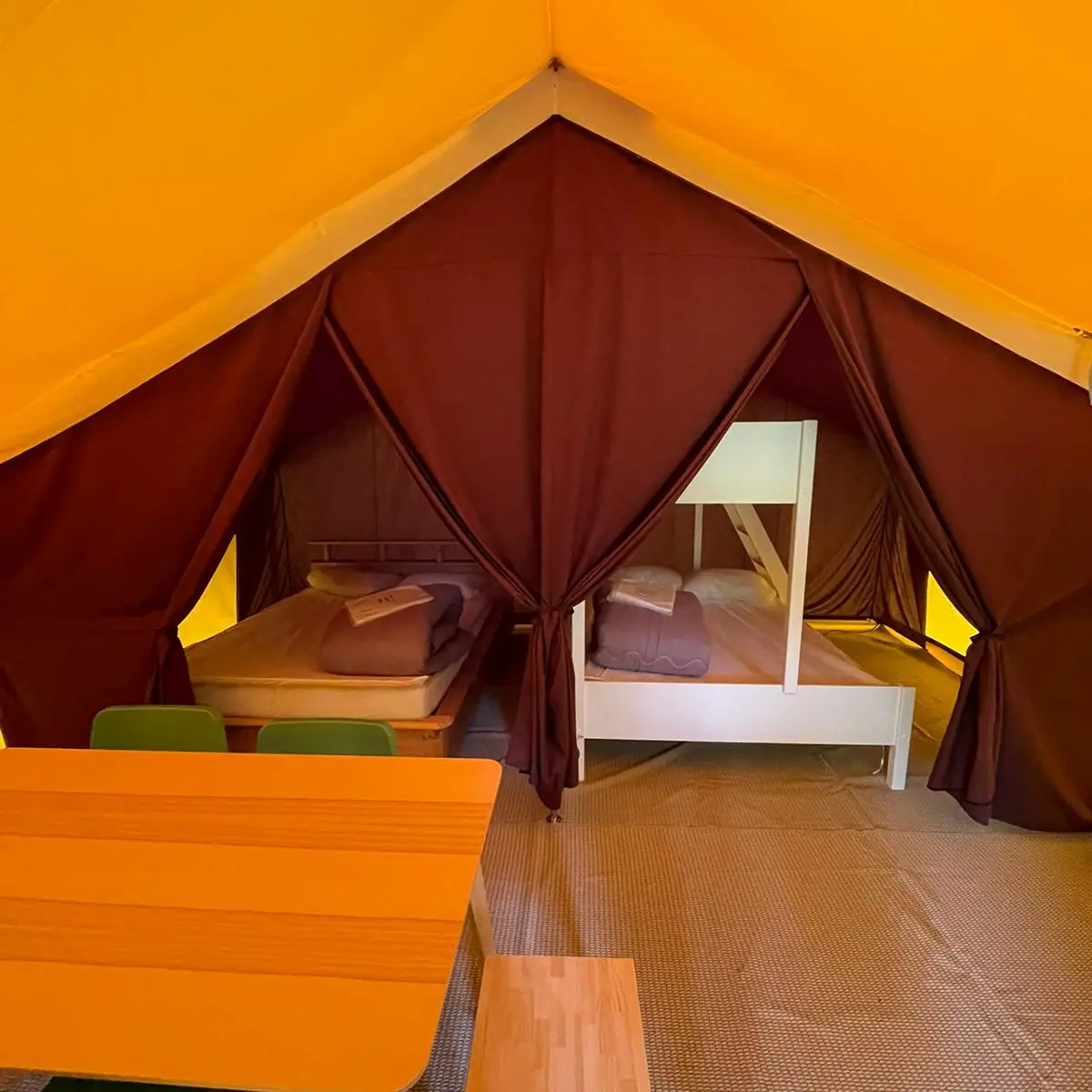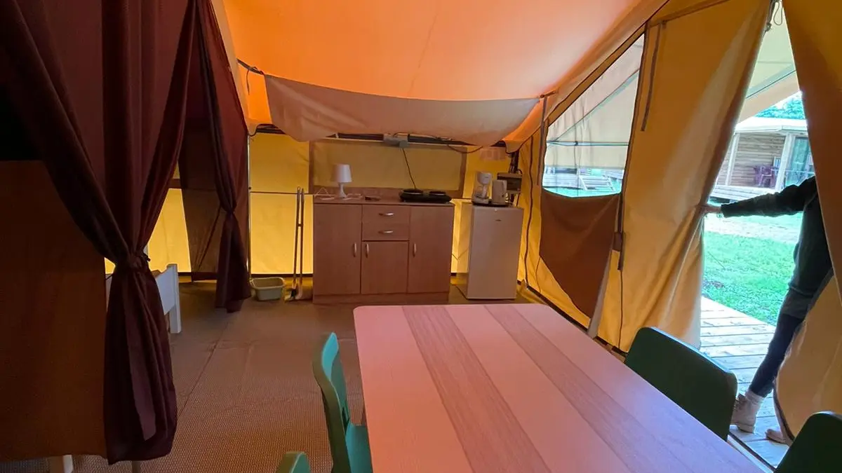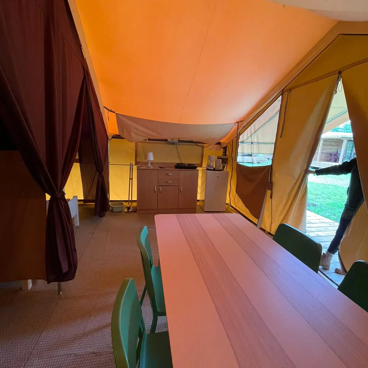La Tente Lodge : mélange harmonieux de toiles et de bois, offrant un confort exceptionnel en camping. Idéal pour les familles en quête de détente et de convivialité.