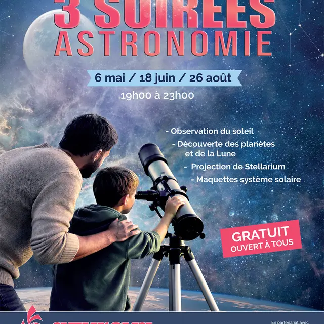 Nous organisons avec l'association Le Chemin des étoiles, 3 soirées astronomie et ouvertes à tous. Vous serez guidés dans la découverte du ciel : observation du soleil jusqu'à son coucher, puis planètes, Lune et constellations.