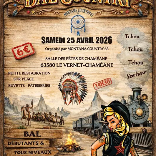 Bal country de l'association Montana Country 63. Venez partager un moment convivial, autour d'un bal country spécial débutants avec initiation, suivi d'un bal tous niveaux. Petite restauration sur place.