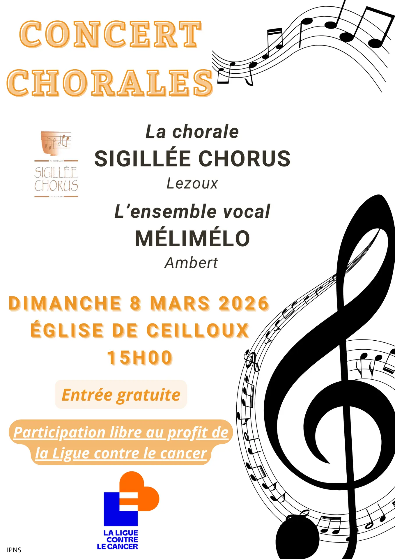 Les chorales Sigillée Chorus de Lezoux et l'ensemble MéliMélo d'Ambert se retrouvent pour un concert en faveur de la ligue contre le cancer.