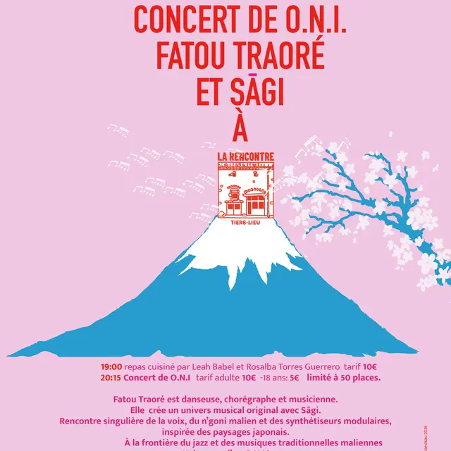 Rencontre singulière de la voix, du n'goni malien et des synthétiseurs modulaires, inspirée des paysages japonais. À la frontière du jazz et des musique traditionnelles maliennes. Naissance d'un O.N.I !