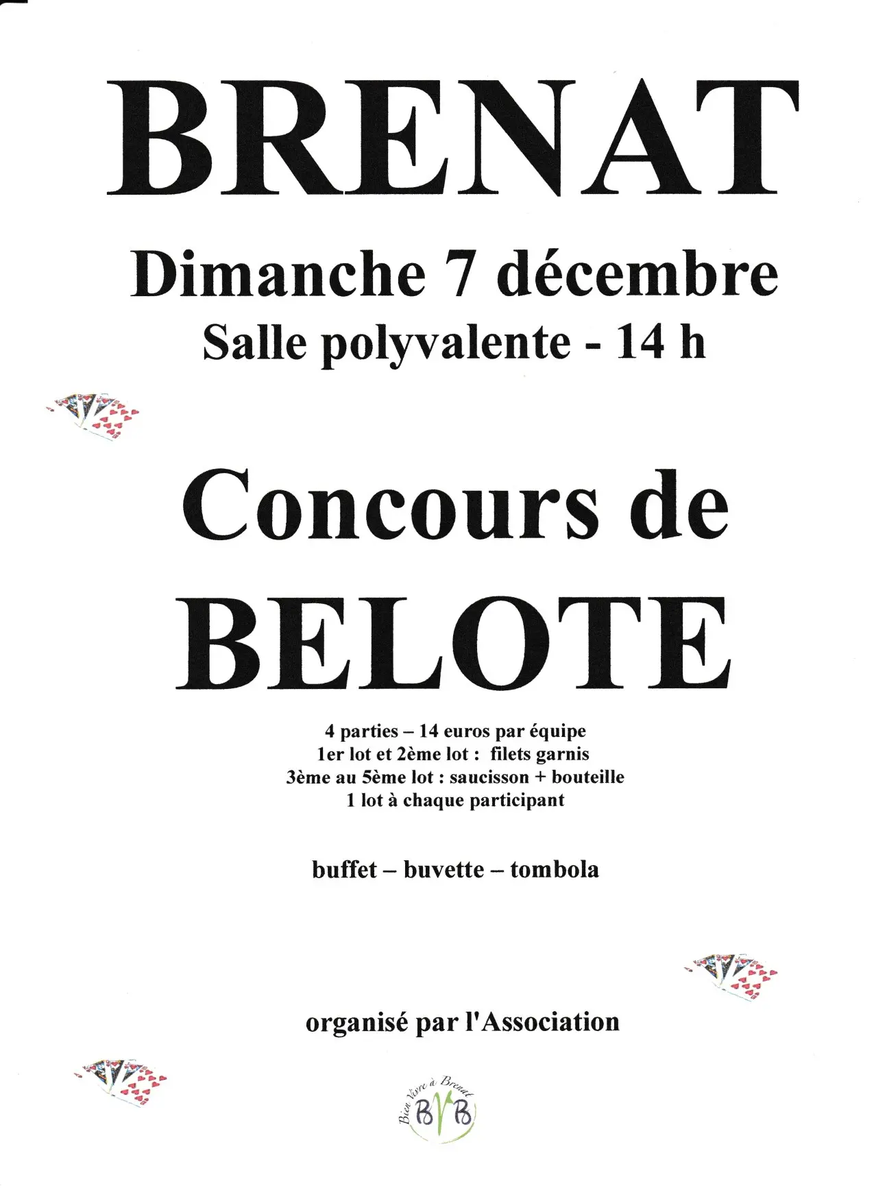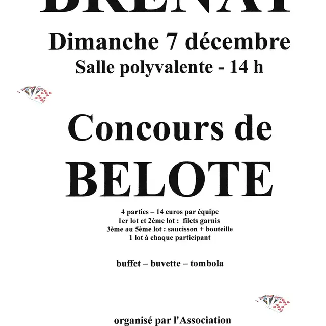 4 parties de 12 dones, classement au nombre de points totalisés à l' issue des 4 parties. Filets garnis pour les 1er et 2ème, lot à chaque participant. Tombola, buvette. Organisé par l'association Bien vivre à Brenat.