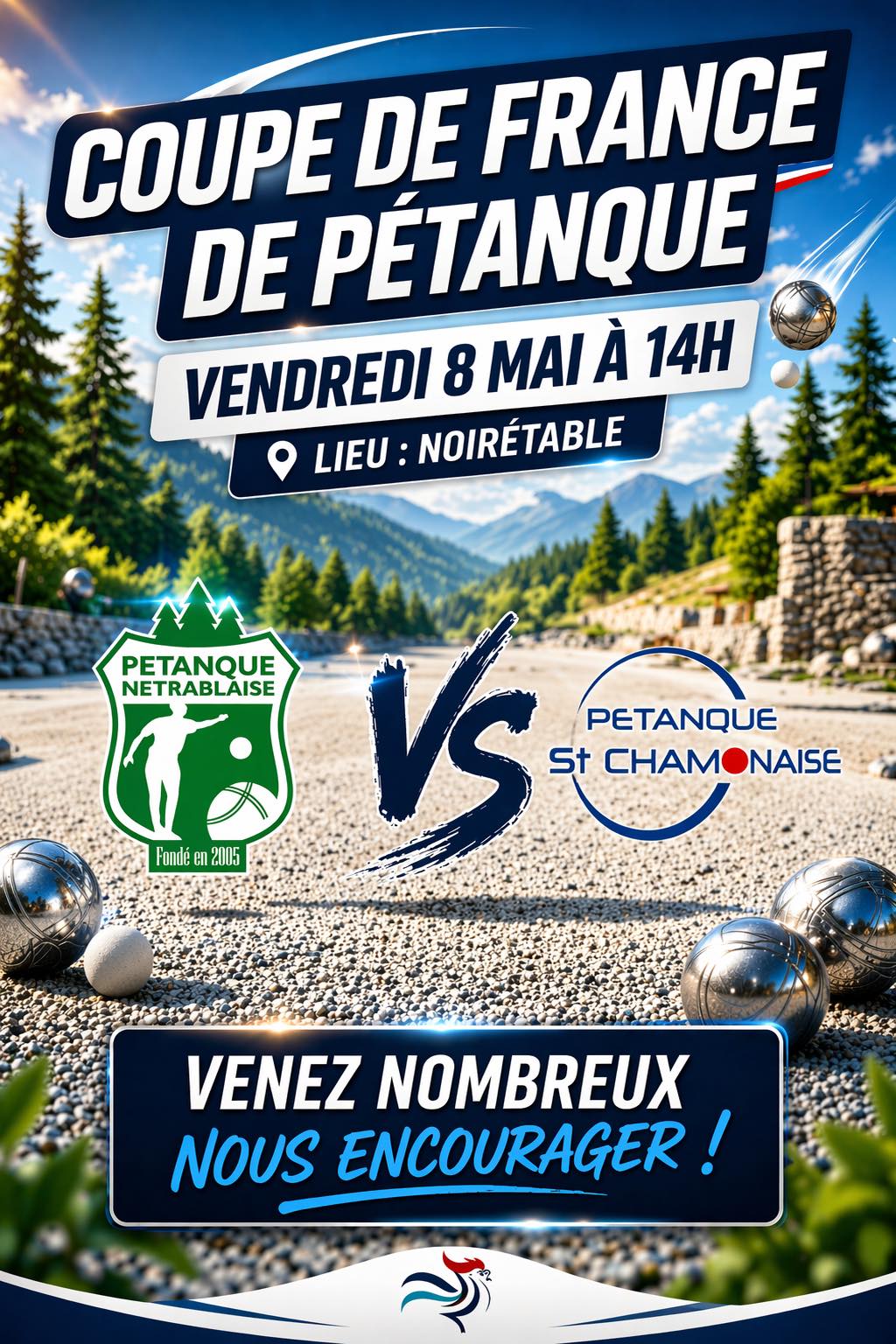 La coupe de France verra s'affronter La Pétanque Nétrablaise et La Pétanque Saint Chamonaise. Venez nombreux les encourager ! Buvette et snacks sur place