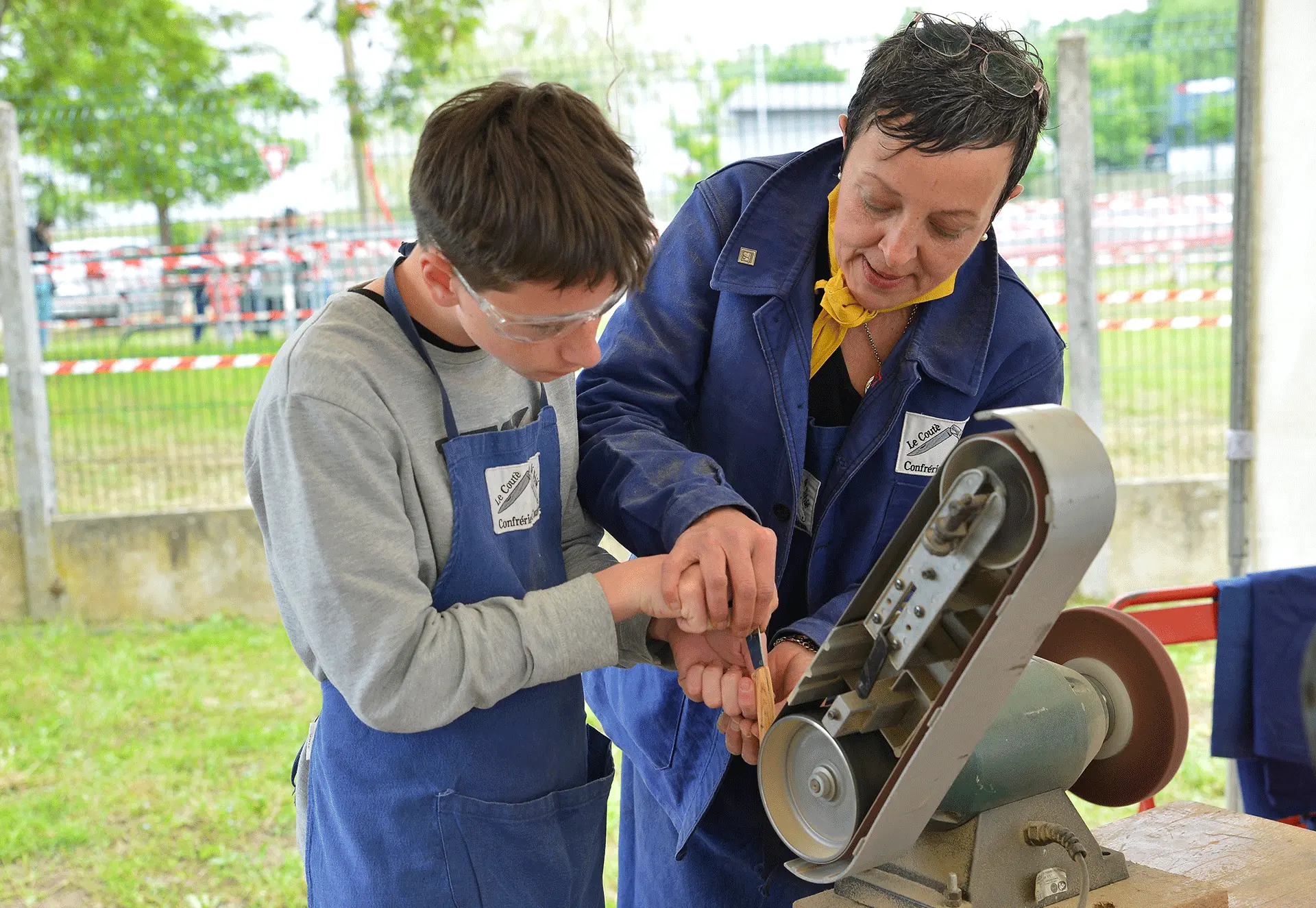 Venir à Coutellia, c’est faire l’expérience d’échanges entre connaisseurs, de la découverte des savoir-faire et techniques de coutellerie. C’est toucher du doigt leur richesse en même temps que ces matériaux si divers, corne et cuivre, cuir et bois, et tant d’autres dont on fait avec l’acier les couteaux de Thiers. Autour des ateliers et des démonstrations, on peut apprécier le tour de main et… mettre la main à la pâte. On trouvera là démonstration et initiation à la forge, au montage, au polissage, à la gravure.