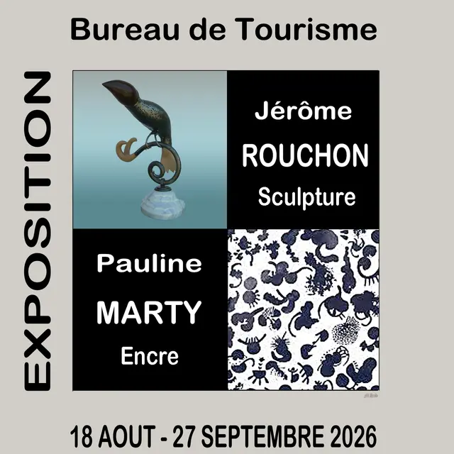 Exposition des sculptures (pierre, métal et bois) de Jérôme Rouchon et des dessins et encres de Pauline Marty.