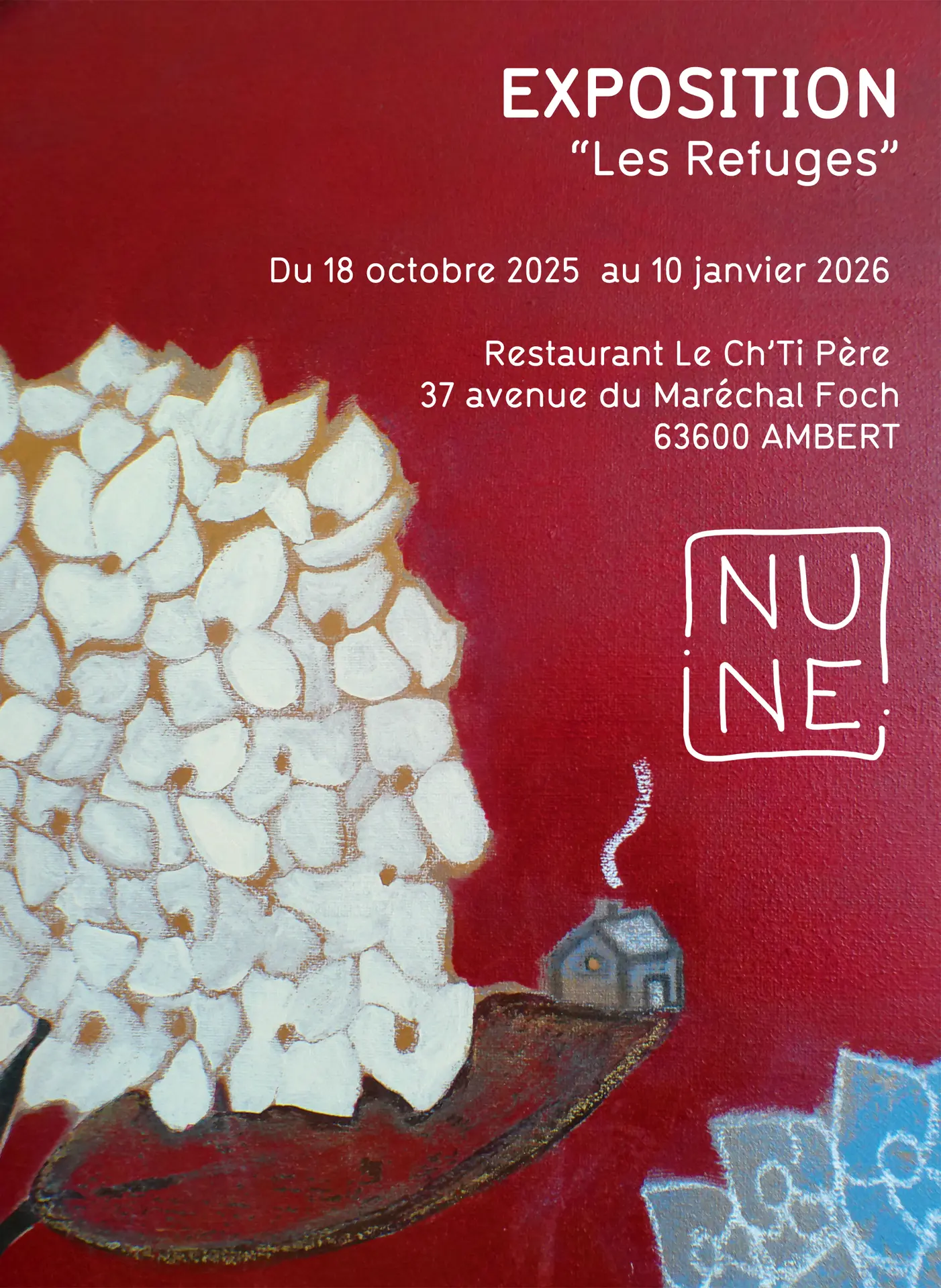 NuNe est autodidacte, elle vit à Bertignat et découvre la peinture pendant la crise du COVID. Passionnée par l'illustration que l'on trouve dans les livres pour enfants, elle aime peindre de petites histoires sur de grands tableaux colorés, à l'acrylique. En réponse à l'anxiété ambiante, NuNe livre une série de toiles réconfortantes qui sont autant de "refuges" que d'invitations à rêver les yeux ouverts.