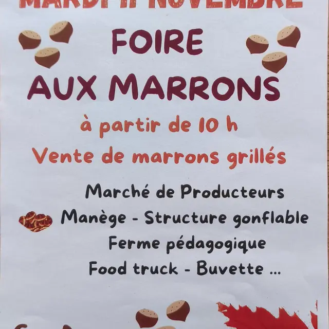 Foire aux marrons organisée par le comité d'animation. Marché de producteurs et de créateurs. Buvette, vente marrons chauds. Animations enfants : manège, structure gonflable ferme pédagogique.