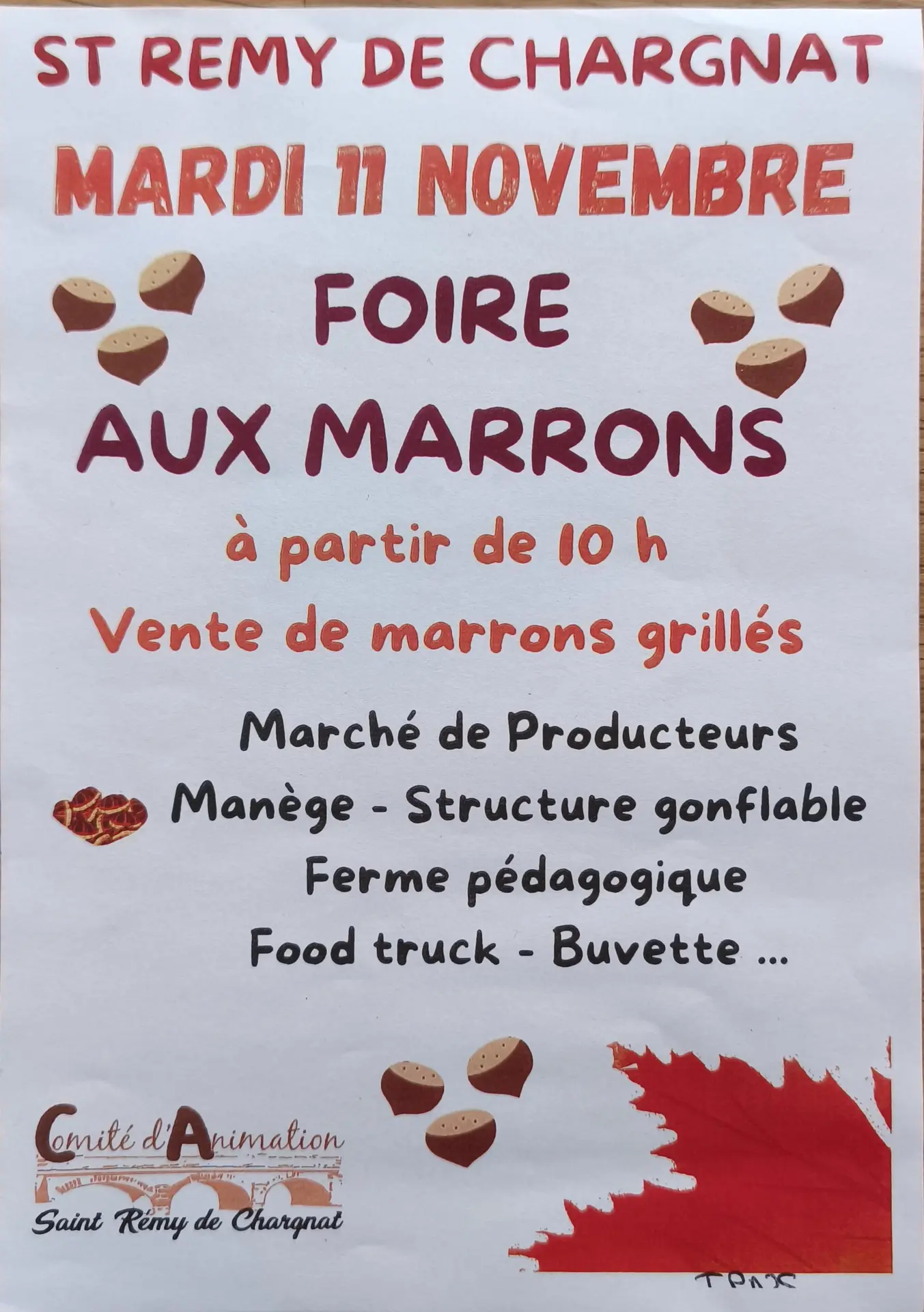 Foire aux marrons organisée par le comité d'animation. Marché de producteurs et de créateurs. Buvette, vente marrons chauds. Animations enfants : manège, structure gonflable ferme pédagogique.