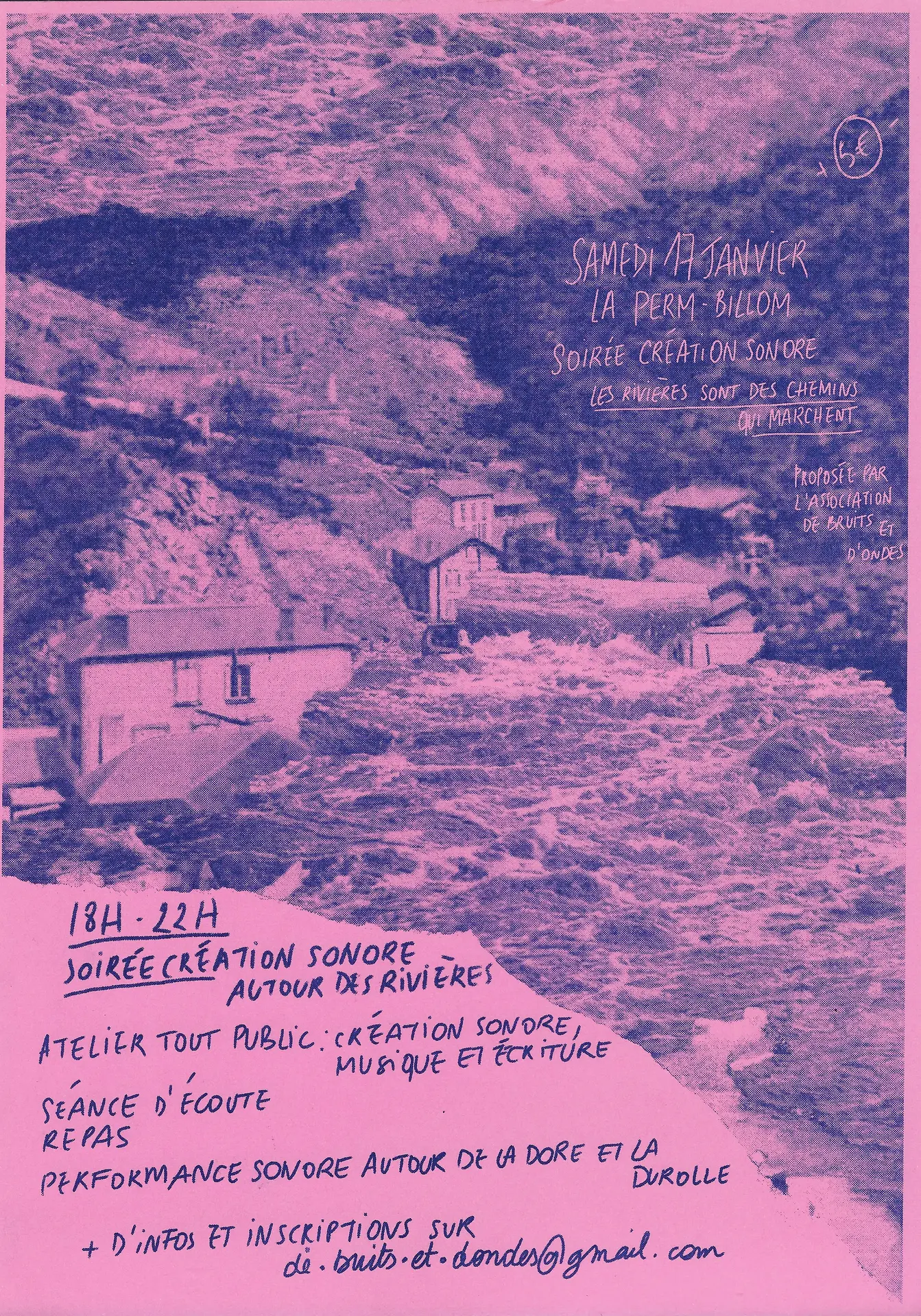 ❆ performance "Les rivières sont des chemins qui marchent"« Les rivières sont des chemins qui marchent », une performance sonore mêlant témoignages, archives et sons autour de la Dore, de la Durolle et du Sabot.