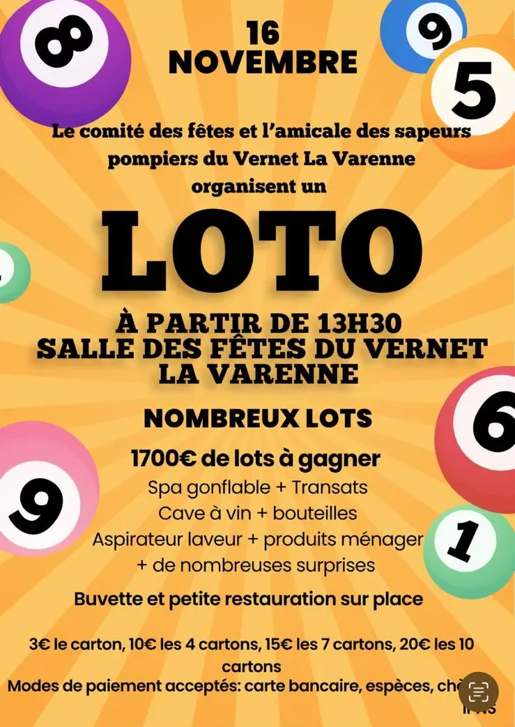 Les pompiers et le comité des fêtes du Vernet le Varenne vous accueillent pour participer à notre loto conjoint. Nombreux lots sont à remporter, 1700 € de lots à gagner.