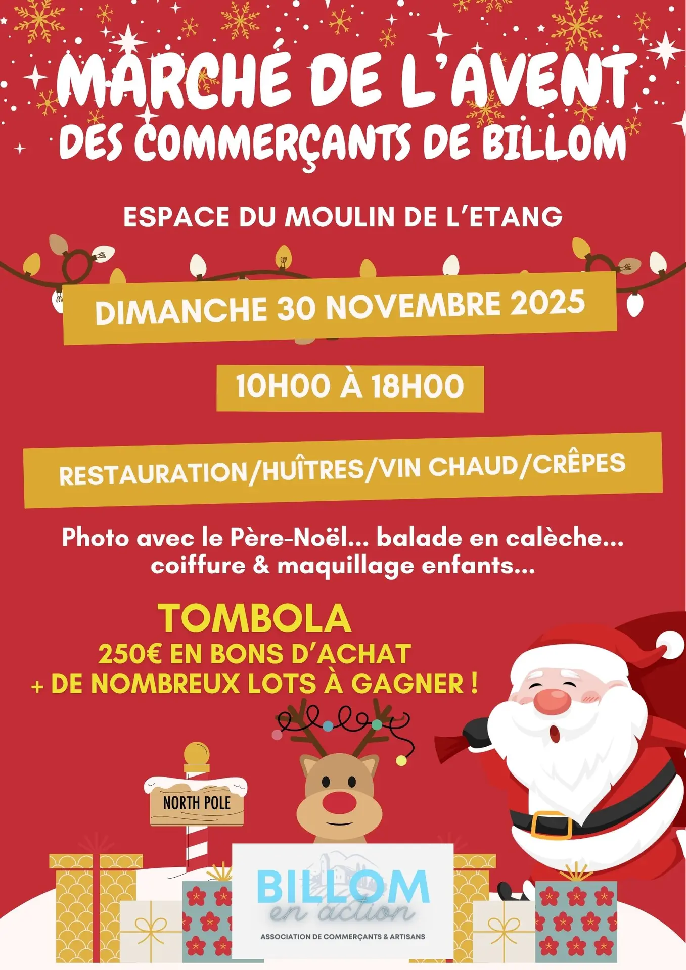 L'association des commerçants de Billom organise son traditionnel Marché de l'Avent qui aura lieu le Dimanche 30 Novembre de 10h à 18h, Salle du Moulin de l'Etang.