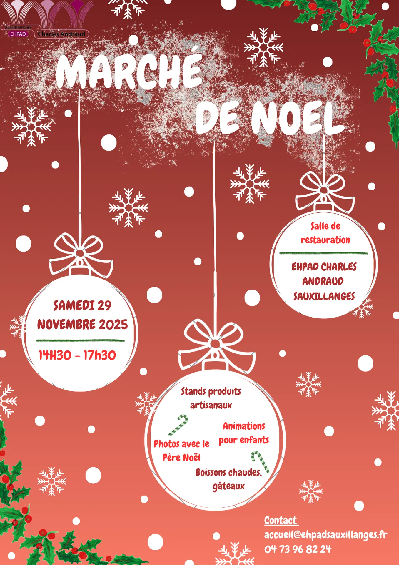 L'EHPAD Charles Andraud de Sauxillanges organise, au sein de son établissement, un marché de Noël. Au programme : artisans, exposants, animations, photo avec le père Noël.