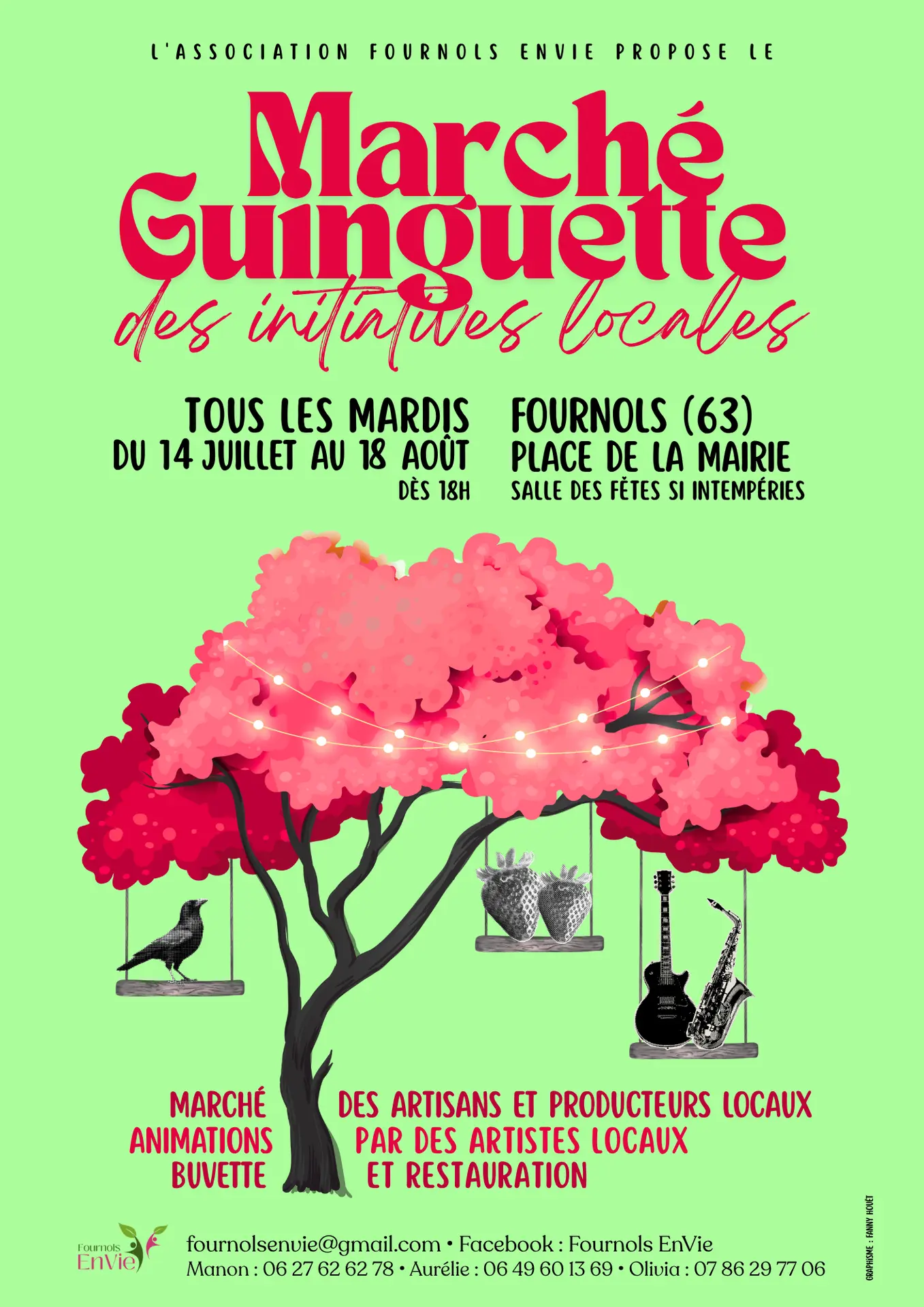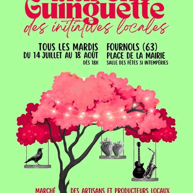 Pour sa deuxième saison, l'association Fournols EnVie remet en place ses marchés d'été, nommés "Marché Guinguette des Initiatives Locales". Producteurs-trices et Artisans-sanes locaux exposeront de nouveau leurs produits à la Place de la mairie de Fournols (ou à la salle des fêtes si mauvais temps), accompagnés par des artistes musicaux. Une buvette restauration saura sustenter chacun et chacune, petits et grands, avec des produits locaux ou régionaux.