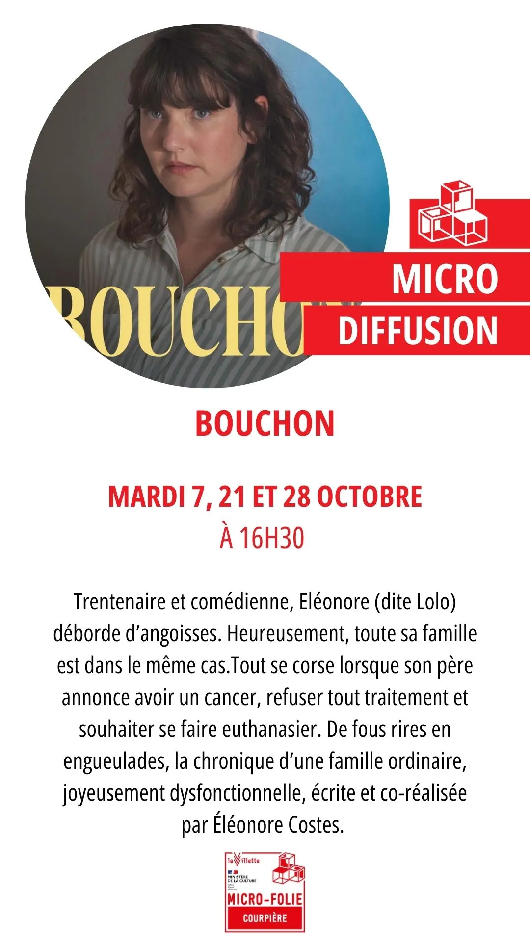 Bouchon: Trentenaire et comédienne, Eléonore (dite Lolo) déborde d’angoisses. Heureusement, toute sa famille est dans le même cas.Tout se corse lorsque son père annonce avoir un cancer, refuser tout traitement et souhaiter se faire euthanasier. De fous rires en engueulades, la chronique d’une famille ordinaire, joyeusement dysfonctionnelle, écrite et co-réalisée par Éléonore Costes.