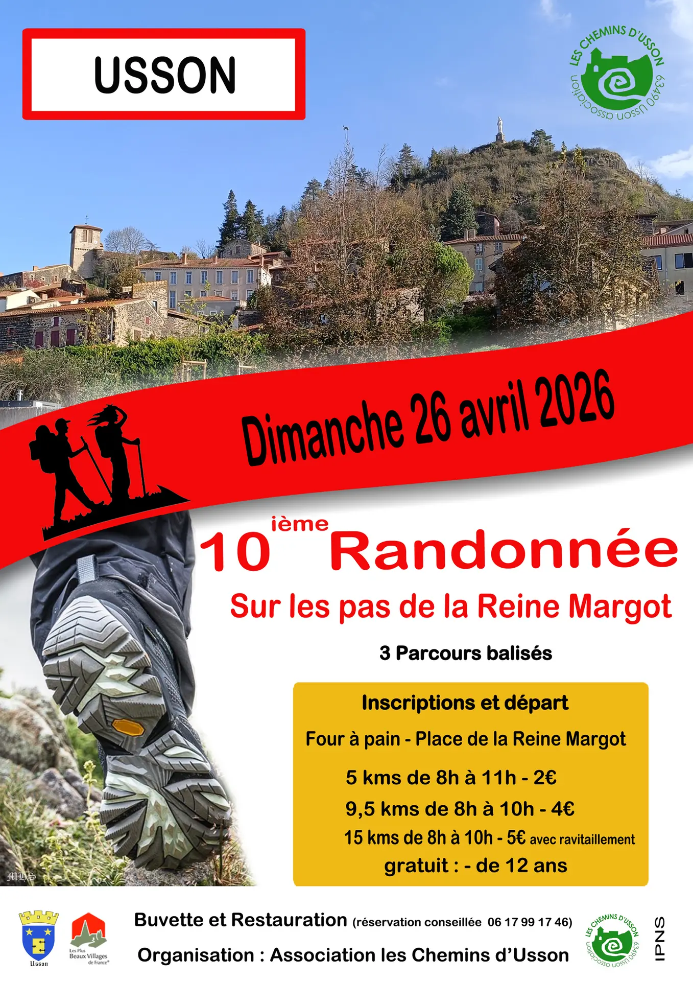 10ème rando pédestre d'Usson "Sur les pas de la Reine Margot" organisée par Les Chemins d'Usson : 3 parcours balisés 5km (départ de 8h à 11h), 9,5km et 15km avec ravitaillement (départ de 8h à 10h). Buvette et restauration à l'arrivée.