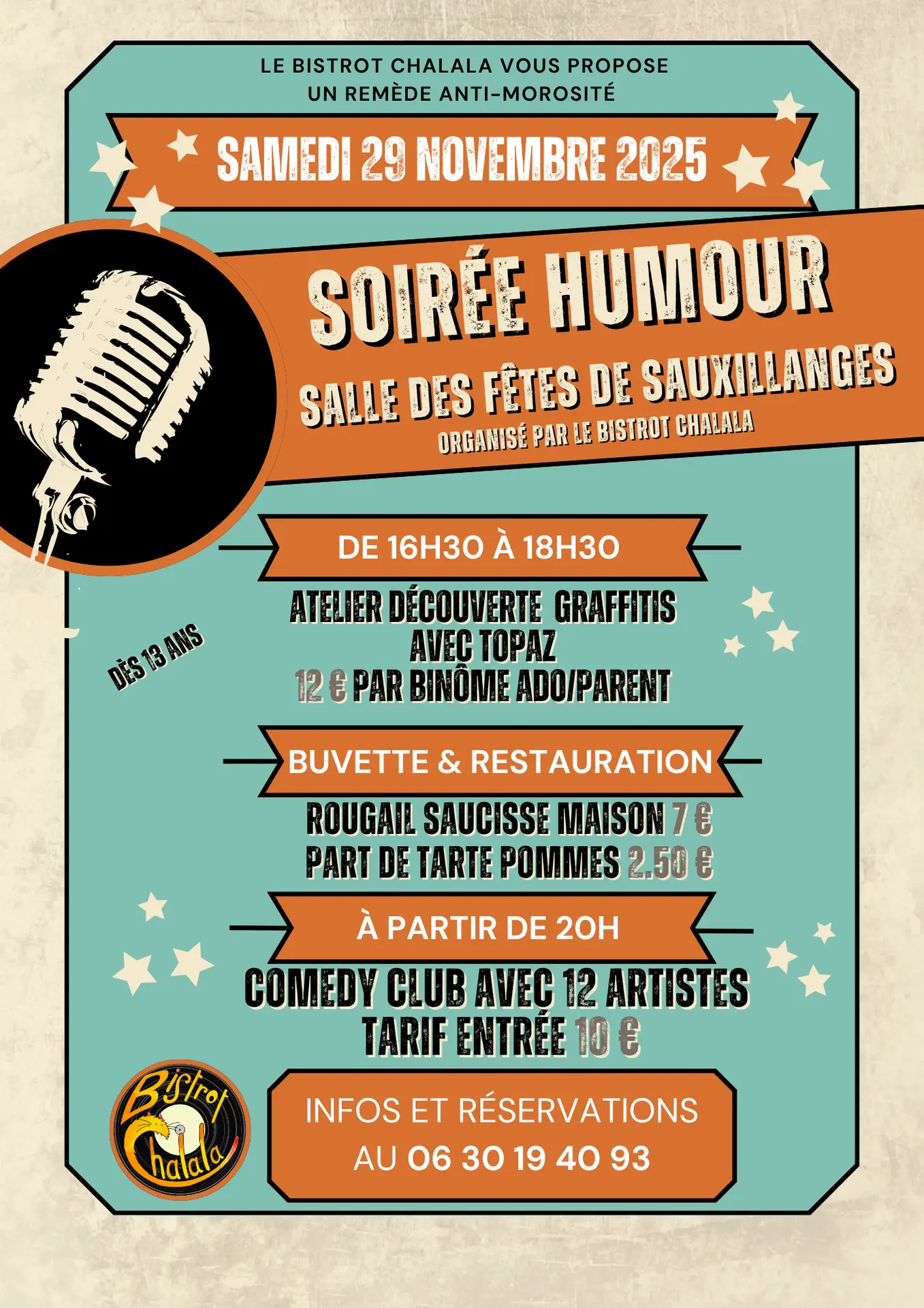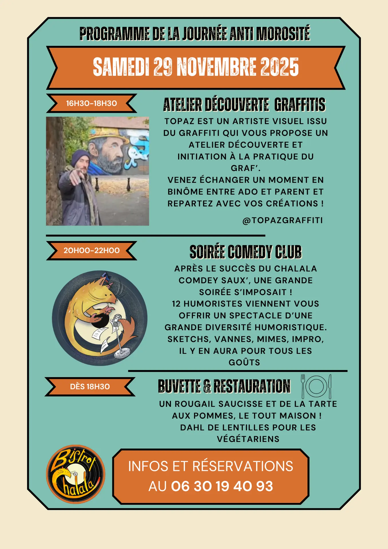 Journée anti-morosité ! Spectacle humour Comedy club avec 14 artistes (sketchs, vannes, mimes, impros). Restauration et buvette dès 18h30 : rougail saucisse maison, dahl de lentilles, part de tarte aux pommes.