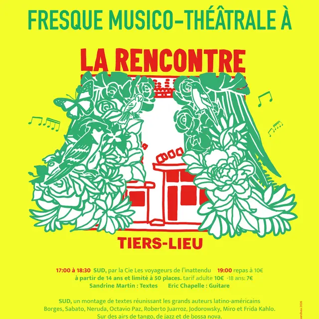 SUD, un montage de textes réunissant les grands auteurs latino-américains Borges, Sabato, Neruda, Octavio Paz, Roberto Juarroz, Jodorowsky, Miro et Frida Kahlo. Sur des airs de tango, de jazz et de bossa nova.