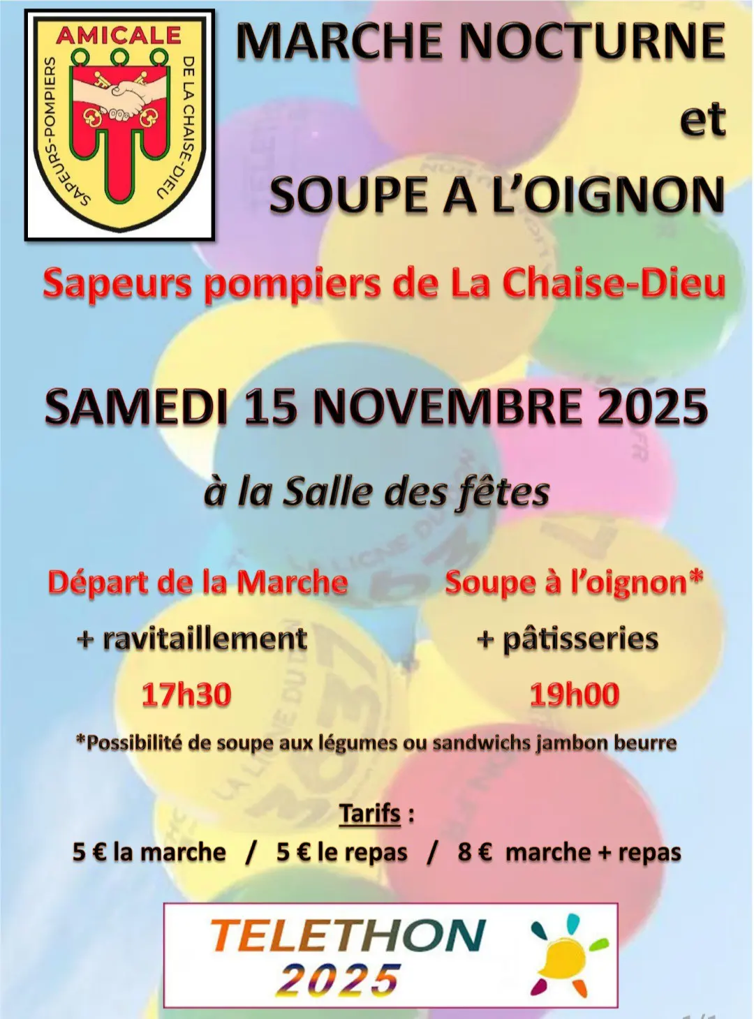 Marche nocturne à 17h30 et soupe à l'oignon dès 19h à la salle des fêtes organisées par les sapeurs pompiers de La Chaise-Dieu au profit du Téléthon