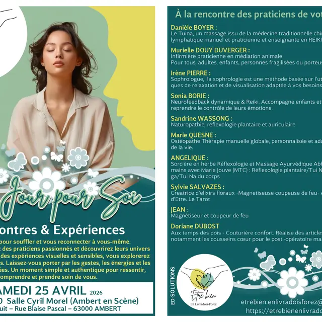 Explorez les pratiques variées. Laissez-vous porter par les gestes, les énergies et les approches proposées. Un moment simple et authentique pour ressentir, comprendre et prendre soin de vous.