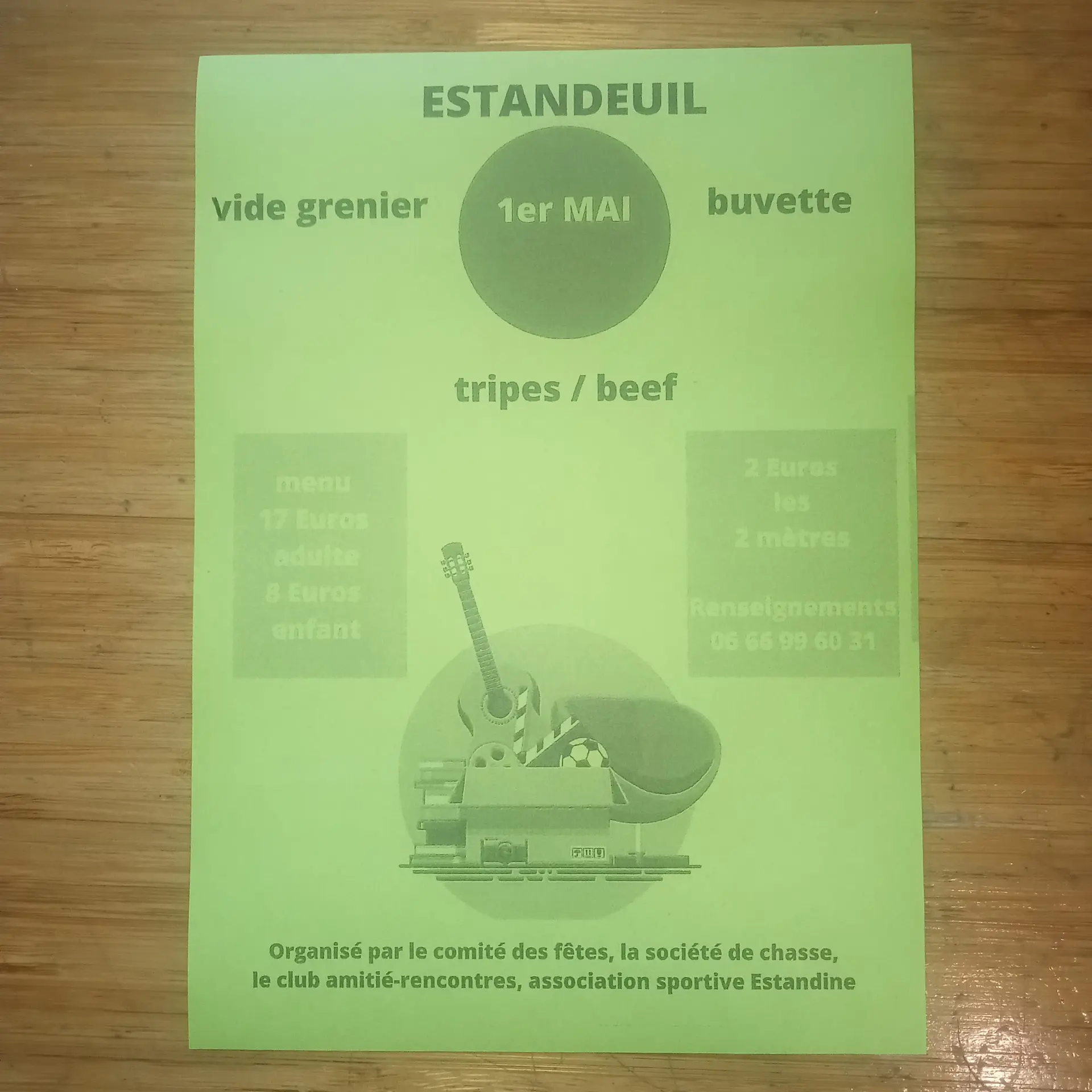 Vide grenier (2 € les 2 mètres), repas (tripes/beef) et buvette sur place. Menu adulte : 17 €, menu enfant : 8 €.