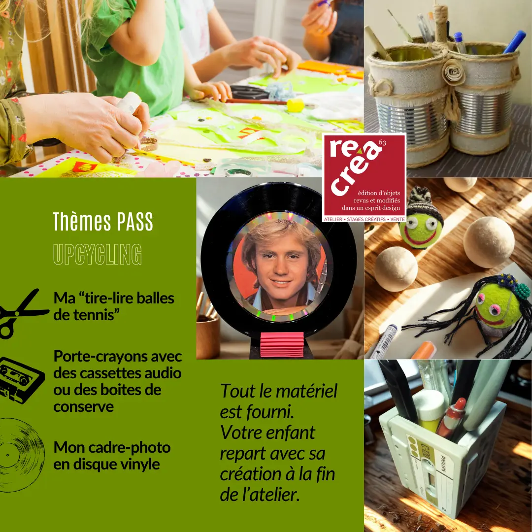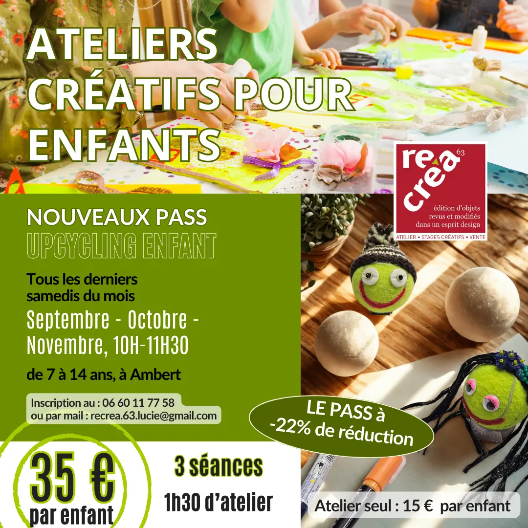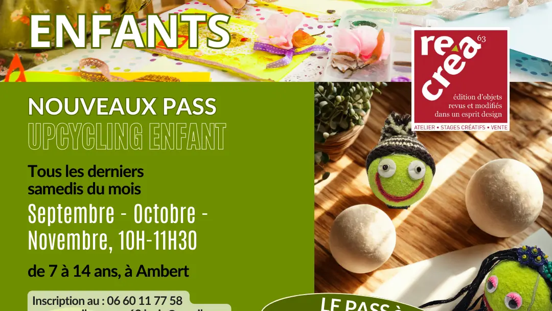 Nouveaux pass : UPCYCLING enfant. Des ateliers créatifs tous les derniers samedis du mois, Septembre - Octobre - Novembre, 10H-11H30 à Ambert. 3 séances d'1h30. Tout le matériel est fourni. Votre enfant repart avec sa création à la fin de l’atelier.