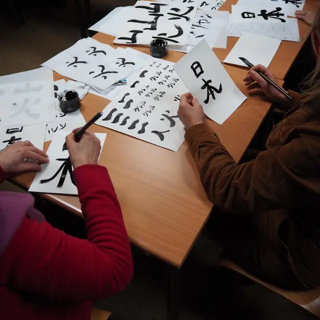 Découvrez la calligraphie japonaise avec Kanako Mitsuzumie et Yann Berne : écrivez votre prénom en katakana, explorez pinceau, encre et papier, et tracez un kanji sur papier d’art. Atelier accessible à tous, matériel fourni.
