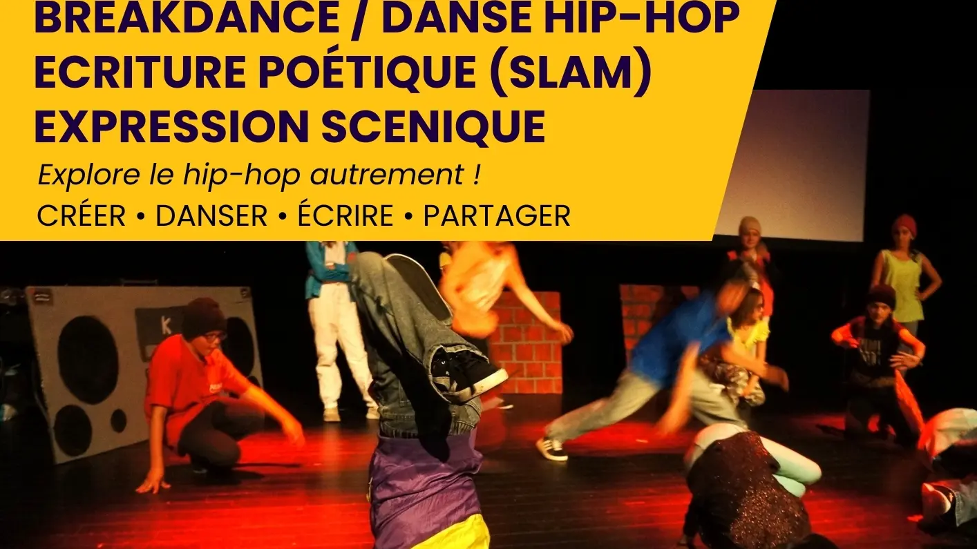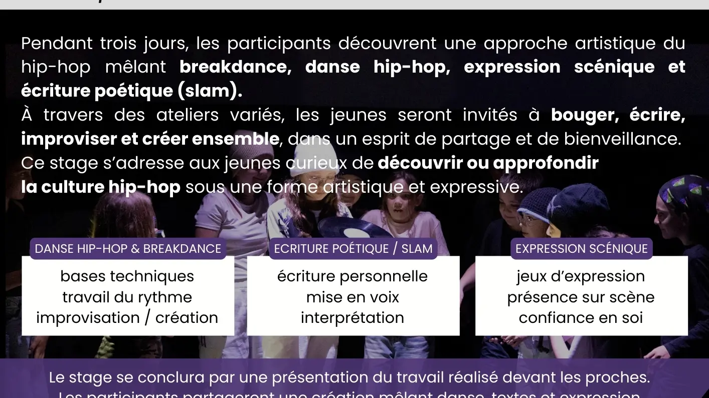 Stage artistique pour les 10–15 ans mêlant breakdance, danse hip-hop, écriture poétique (slam) et expression scénique. Trois jours pour bouger, écrire et créer ensemble autour de la culture hip-hop. Restitution conviviale en fin de stage.