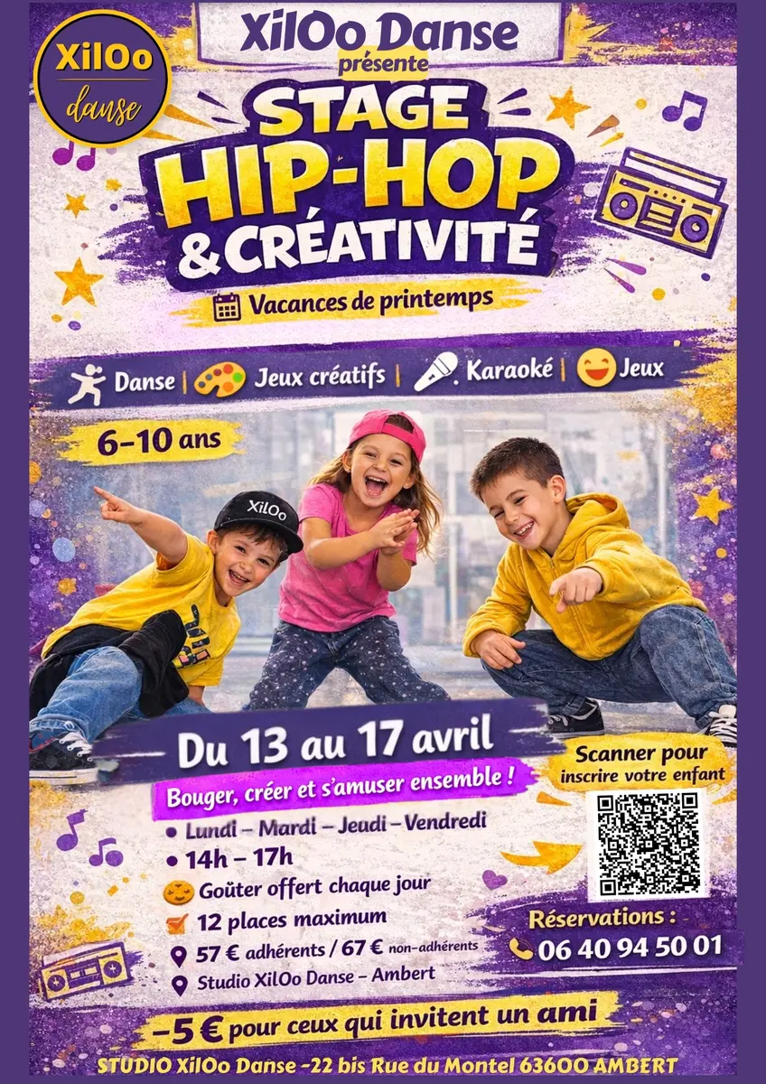 Pendant les vacances de printemps, XilOo Danse propose à Ambert un stage Hip-Hop & Créativité spécialement conçu pour les enfants de 6 à 10 ans.