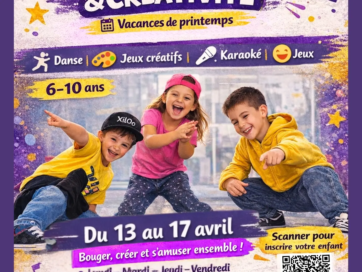 Durant quatre après-midi, les enfants découvriront la culture hip-hop à travers des activités ludiques mêlant danse, jeux créatifs et expression artistique.